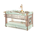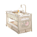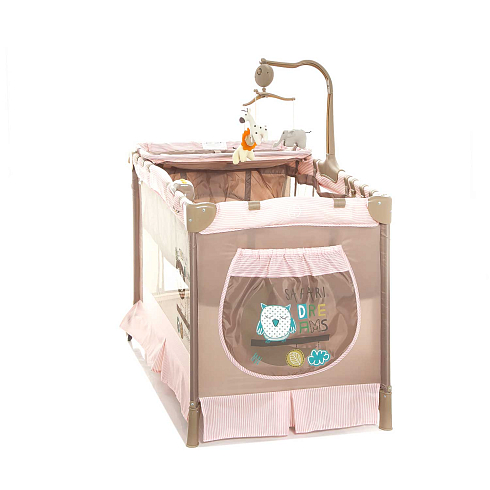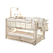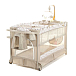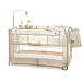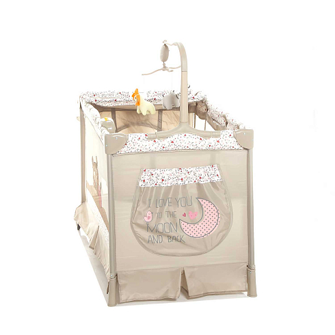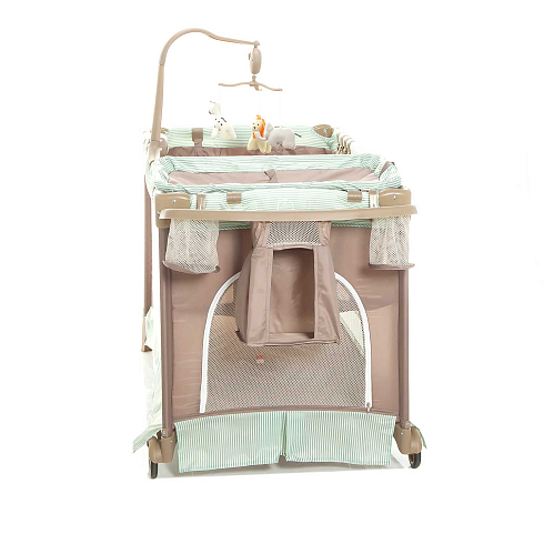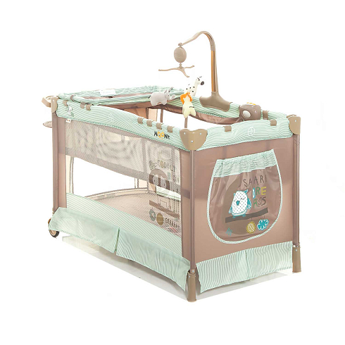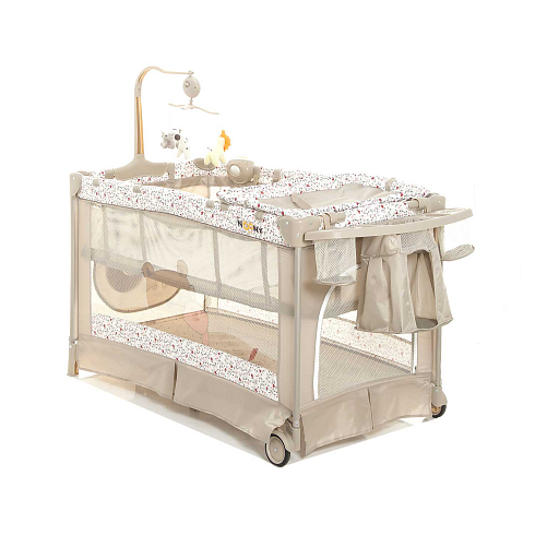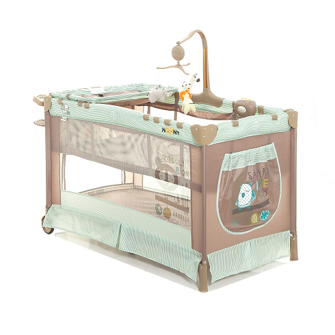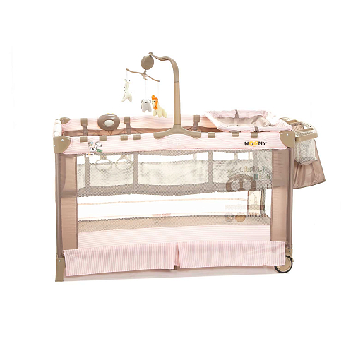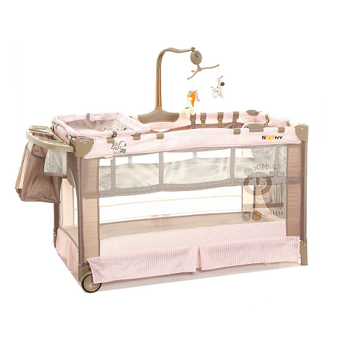 Детский манеж манеж Noony Сubby. Комплектуется навесным пеленальным столиком, верхним спальным уровнем, матрасом, навесной полкой-органайзером для подгузников и гигиенических принадлежностей, музыкальным мобилем с игрушками, навесным блоком (с подсветкой, музыкой и вибрацией), хватательными кольцами для малыша, двумя колесами со стопорами (для облегчения перемещения). На боку манежа - кармашек. Имеются полозья для укачивания.