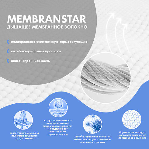 Данная модель изготовлена из инновационного материала Membranstar (технология итальянской марки Stellini), имеющего бархатистую текстуру материала, которая исключает скольжение простыни во время сна.